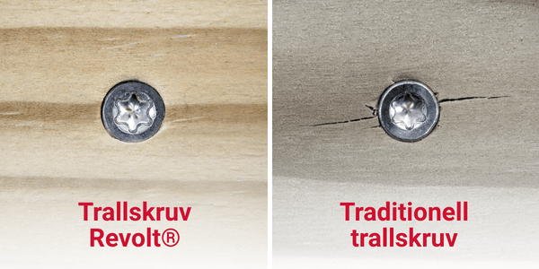 Det cylindriska huvudet ger en diskret och jämn försänkning som smälter in i trallens yta. Den specialutformade gängan bidrar till en kontrollerad indragning och minskar belastningen på träet, vilket reducerar risken för sprickbildning – även nära kant. Resultatet är en snygg och enhetlig finish utan flisor, samtidigt som trallen hålls på plats över tid.